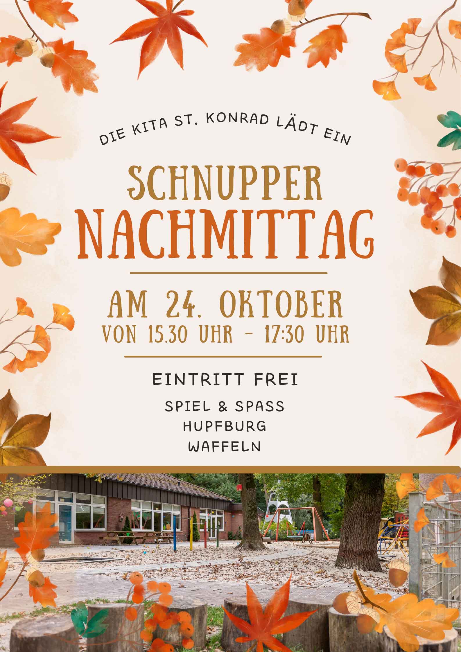 Wer demnächst einen Platz in einer Kindertageseinrichtung oder bei einer Tagespflegeperson sucht, sollte sich Freitag, den 24. Oktober 2025, dick im Kalender markieren: Die Kindertageseinrichtung St. Konrad öffnet von 15:30 bis 17:30 Uhr ihre Türen für einen bunten Schnuppernachmittag – ein Angebot für alle Familien, die neugierig auf die Einrichtung, das Team und das pädagogische Konzept sind.